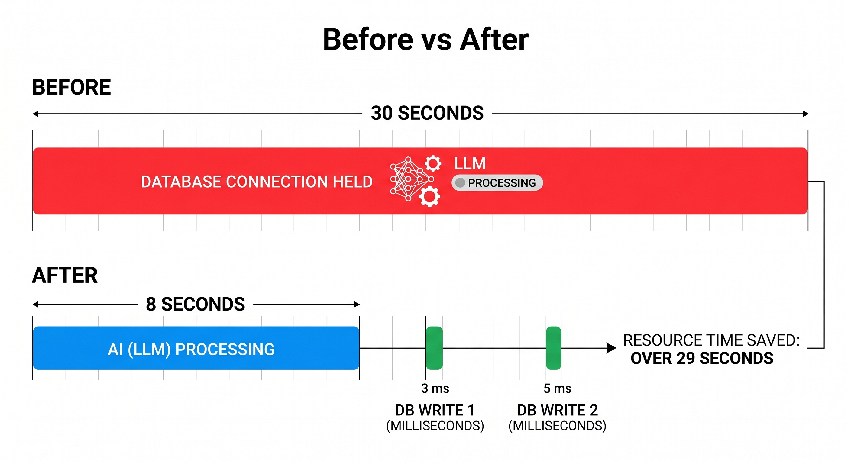 - Call LLM to process query (10-30 seconds, connection still sitting there)