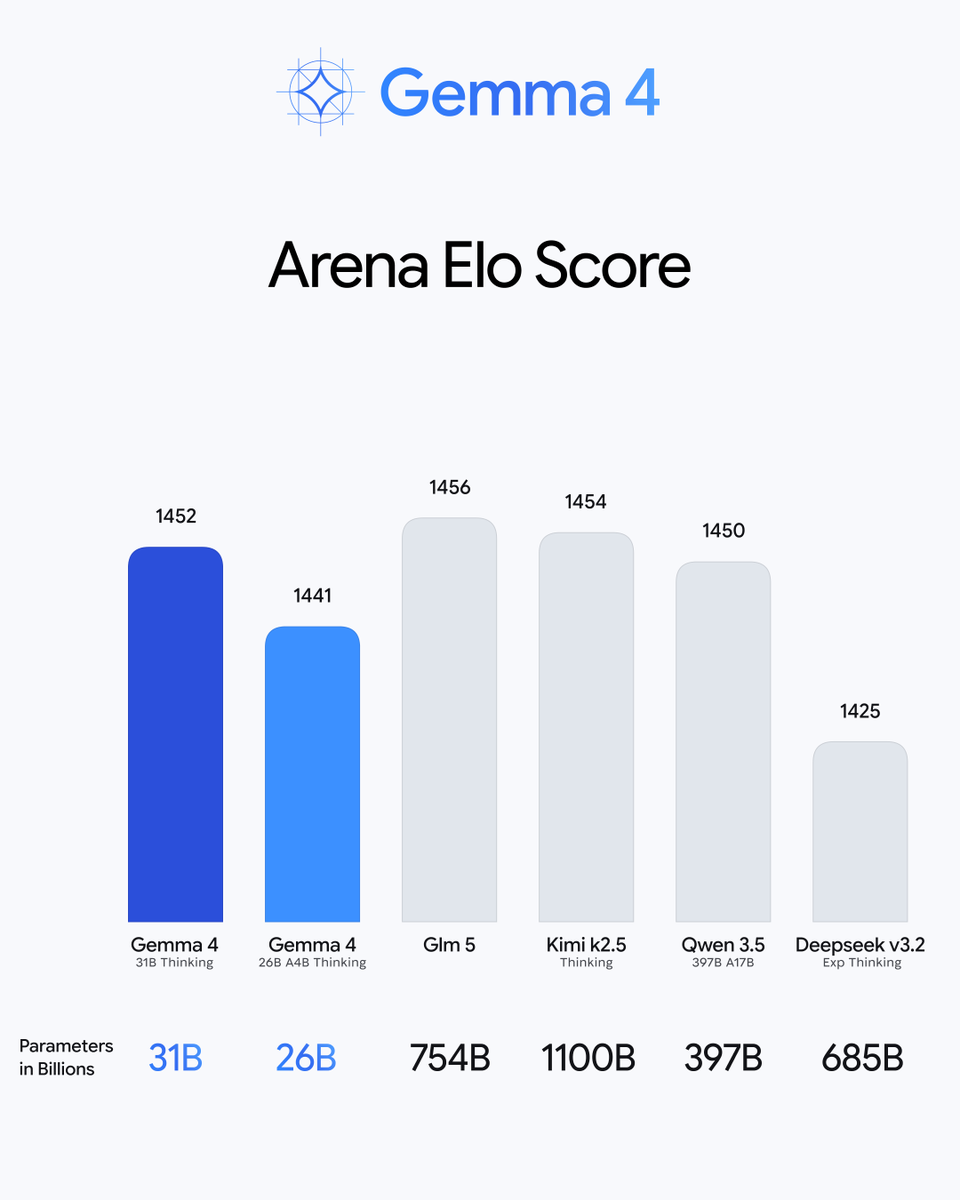 Gemma 4's 31B model is outscoring GPT-4 class systems on Arena Elo — models with 10× more parameters. Kimi k2.5 runs 1100B. Qwen 3.5 runs 397B. GLM-5 runs 754B. Gemma 4 31B sits at 1452, ahead of most of them.