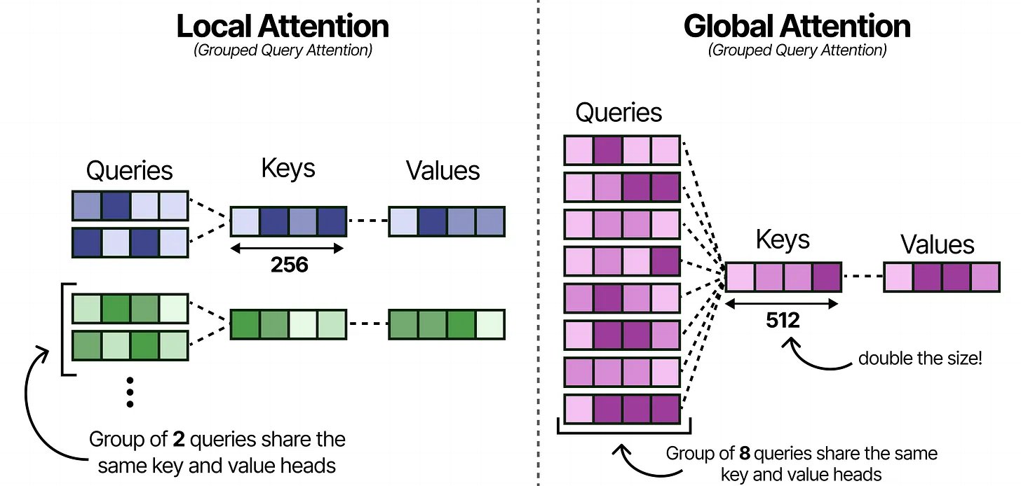 Local layers share at 2:1, global layers at 8:1 — fewer KV pairs, but each Key is doubled in size to compensate. — Maarten Grootendorst