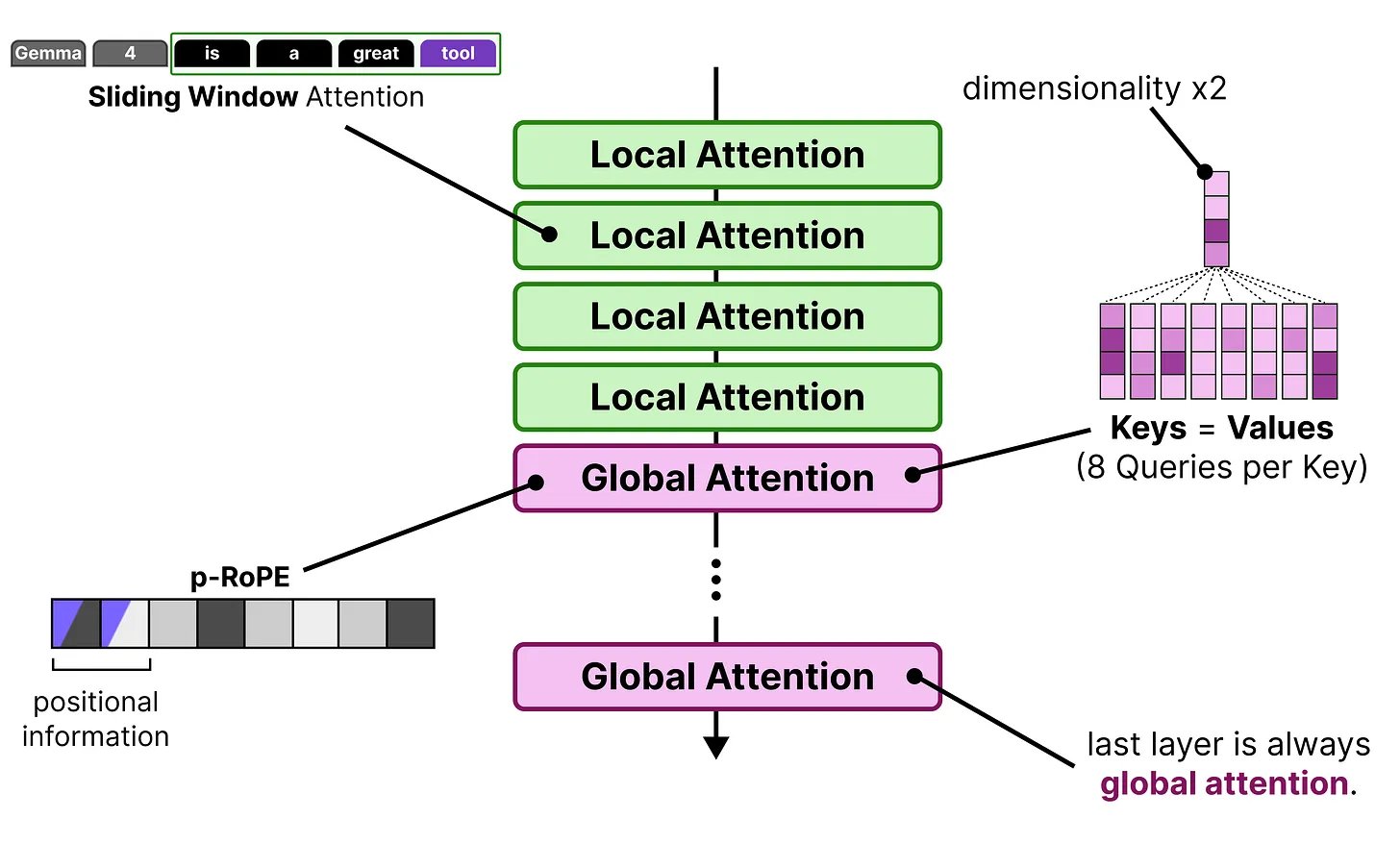 Gemma 3 already did this. What Gemma 4 changed is small but matters: the last layer is always global. In Gemma 3, the interleaving pattern could land a local layer at the end, which meant the model's final representation — the one that actually generates the output — might not have full visibility over the context. That's now fixed.