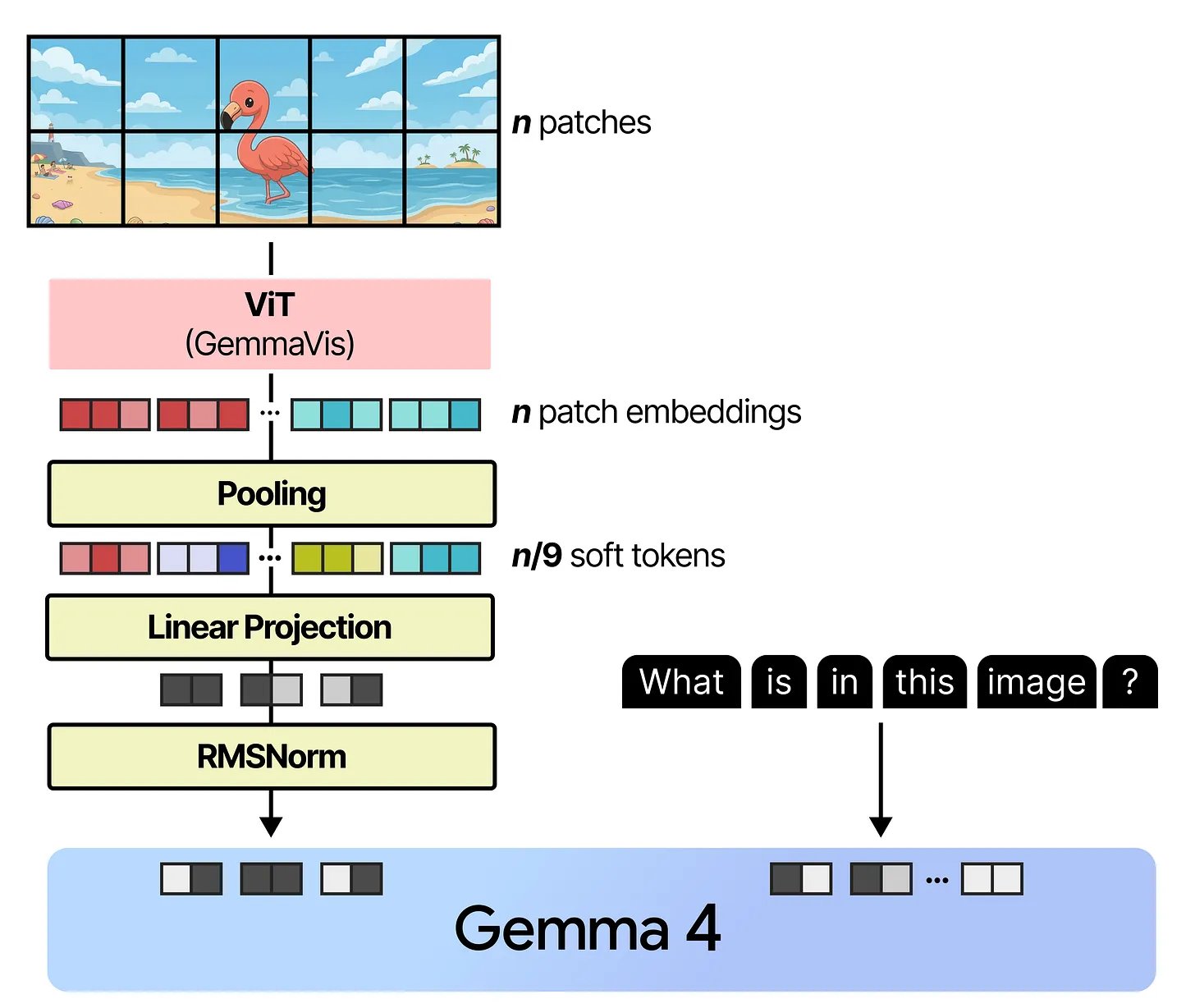 After the ViT produces patch embeddings, neighbouring patches are merged in 3×3 blocks (averaged) to bring the count down, then a linear projection + RMSNorm transforms them to match the language model's embedding space. At that point, image tokens and text tokens sit side by side in the same sequence and get processed together.