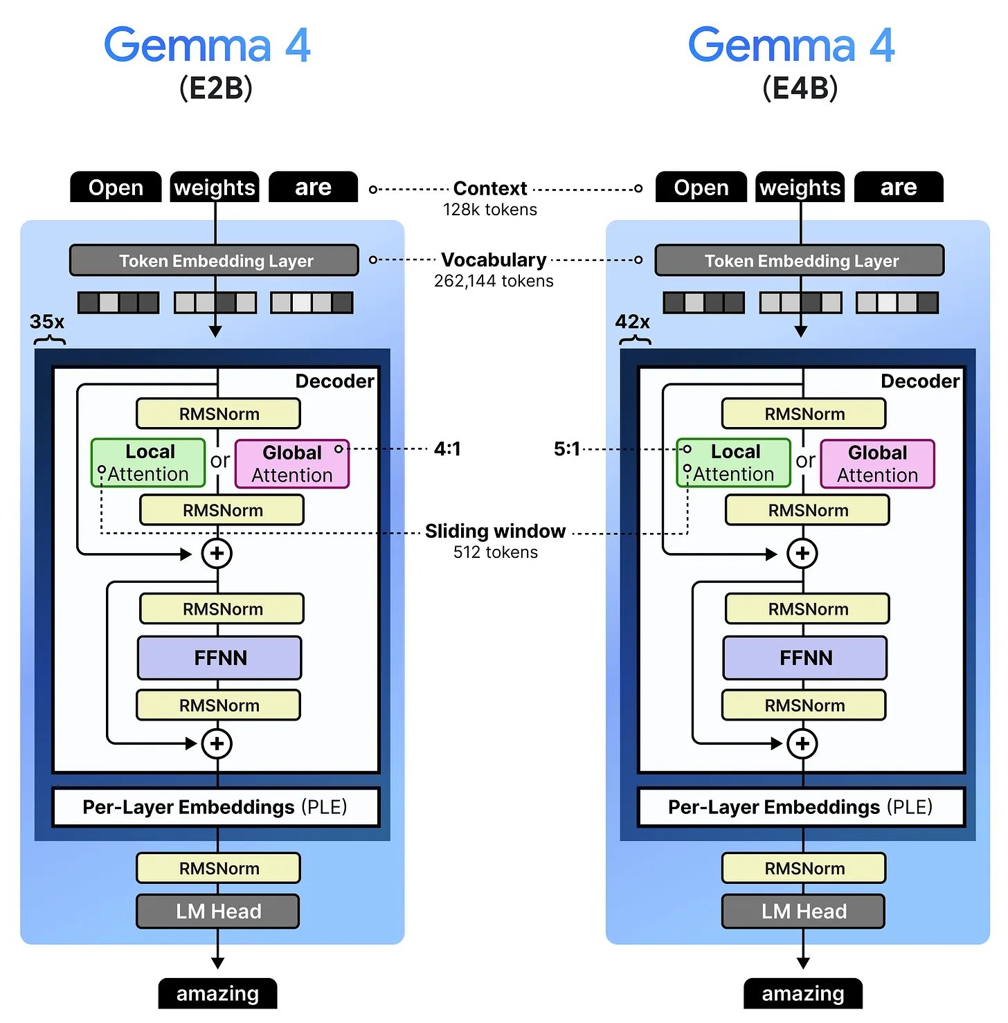 Each fix is surgical, and they don't interfere with each other. That's what makes the family work — the same architectural base adapts cleanly to a 2B phone model and a 31B GPU model.